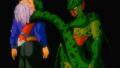 トランクスとセルの闘いは、空中戦に変わり、上空で二人が激しく交戦した。互角の展開のまま推移し、双方共に体の数箇所に傷を負った。